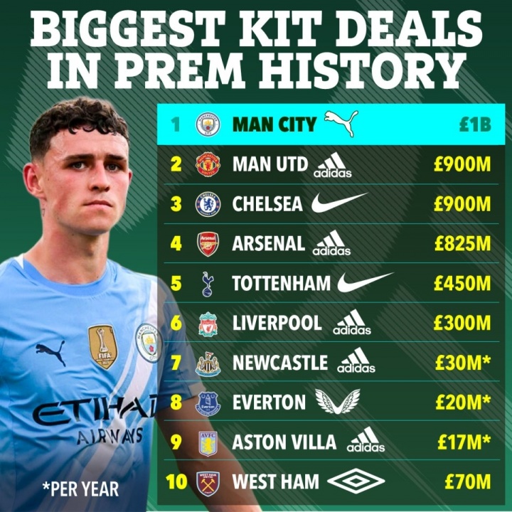 1-曼徹斯特城,彪馬,10年內(nèi)10億